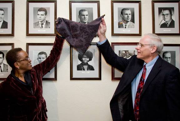 Valerie Smith and Robert Wuthnow unveiled the senior picture of Michelle Obama on the Class Photo Wall at the Tap Room. (Photo: Brian Wilson)