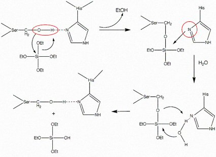 Mechanism for the catalysis of TEOS hydrolysis by the silicatein molecule.[4]