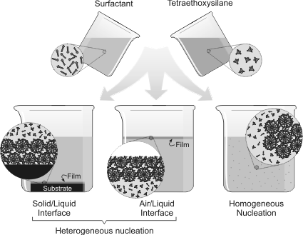Generalized mechanisms for forming structured silica through the interaction of a structure-directing agent (surfactant) and silicon alkoxide (TEOS). Incorporating a catalytic agent within the template structure speeds the silicification of the template.[6]