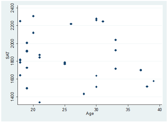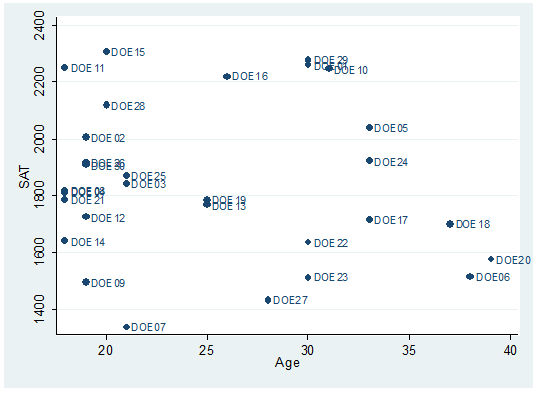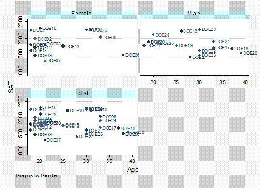 twoway scatter sat age, mlabel(lastname) by(gender,