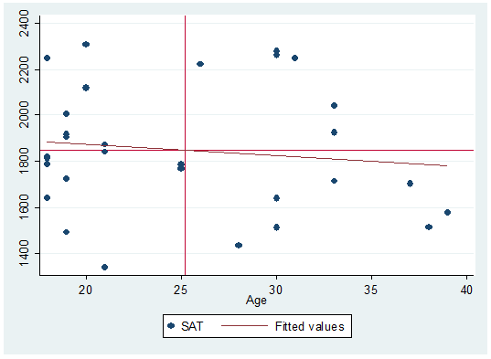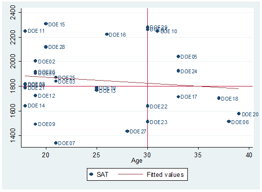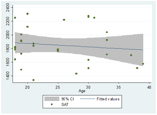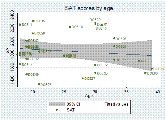 twoway (lfitci sat age) || (scatter sat age, mlabel(lastname) mlabv(position)),