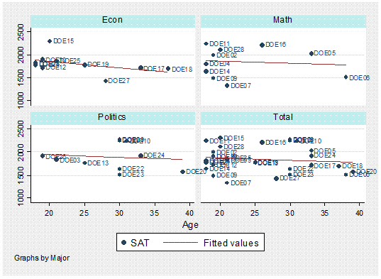 twoway scatter age sat, mlabel(lastname) by(major, total)