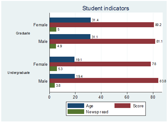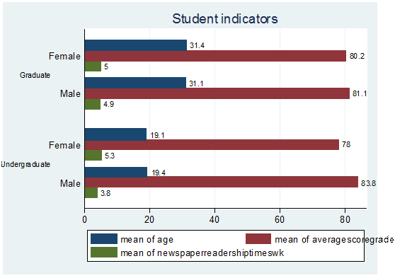 graph hbar (mean) age averagescoregrade newspaperreadershiptimeswk, over(gender) over(studentstatus, label(labsize(small)))