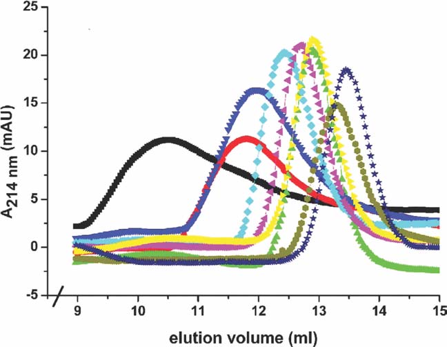 Actin is one of the proteins that rely on chaperonins for proper folding. This paper shows that the thermal unfolding of G-actin, as studied by CD and ultraviolet difference spectrometry, coincides with a loss in DNase I-inhibiting activity of the protein. Thus, the DNase I inhibition assay should be useful for systematic studies of actin unfolding and refolding. Using this assay, we have investigated how the thermal stability of actin is affected by either Ca2 + or Mg2 + at the high affinity divalent cation binding site, by the concentration of excess nucleotide, and by the nucleotide in different states of phosphorylation (ATP, ADP.Pi, ADP. Vi, ADP.AlF4, ADP.BeFx, and ADP). Actin isoforms from different species were also compared, and the effect of profilin on the thermal stability of actin was studied. We conclude that the thermal unfolding of G-actin is a three-state process, in which an equilibrium exists between native actin with bound nucleotide and an intermediate free of nucleotide. Actins in the Mg-form were less stable than the Ca-forms, and the stability of the different isoforms decreased in the following order: rabbit skeletal muscle alpha-actin = bovine cytoplasmic gamma-actin > yeast actin > cytoplasmic beta-actin. The activation energies for the thermal unfolding reactions were in the range 200-290 kJ.mol- 1, depending on the bound ligands. Generally, the stability of the actin depended on the degree with which the nucleotide contributed to the connectivity between the two domains of the protein. |