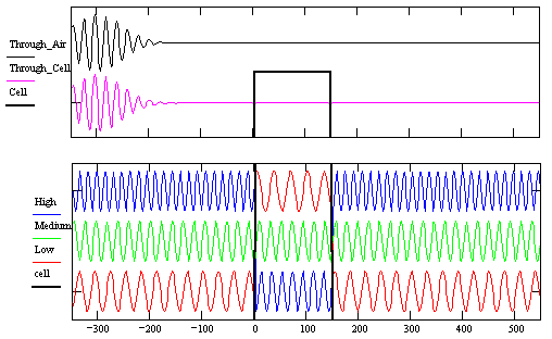 Group Velocity in Dispersive MediaI. Positive (normal) dispersion. This is what happens in most light-matter interaction. The medium has higher index of refraction for higher frequencies; the frequency components of a pulse are dispersed such that the long wavelengths become even longer, the short ones even shorter. When they recombine to create a new pulse after going through the cell, the pulse appears delayed (the red pulse, travelling through medium, is delayed from the black pulse, travelling through air). Hence, the group velocity (velocity of the pulse) is smaller than c.