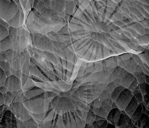 This image, taken with an electron microscope, is of a niobium plate. To investigate the effects of impure particles on superconducting cavities for accelerators, small vanadium particles were deposited on the plate, which was then charged with several kilovolts relative to a nearby electrode. The intense electric fields that formed on the sharp edges of the vanadium particles caused them initiate high voltage breakdown. Plasma was created, and as it expanded and dissipated, it left behind complex starburst patterns on the surface.