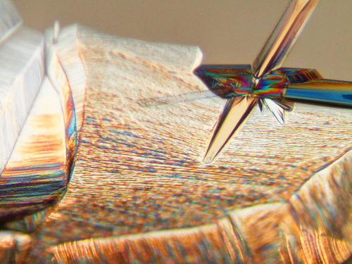 Taken with the optical microscope, this is a work about crystal growth. As a magnesium sulphate solution cools, epsomite and hexahydrite crystals form.