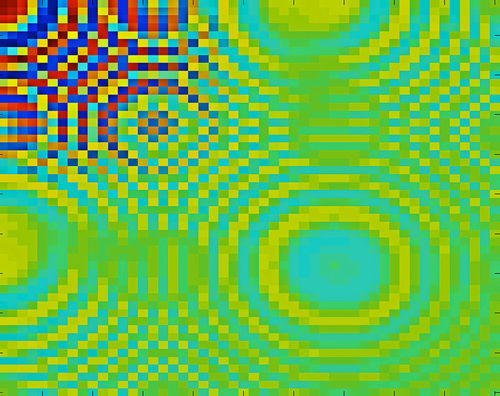 Light falling through a small circle onto a screen diffracts into rings of differing intensities at different distances. This simulation should have produced a single bull's-eye pattern of wave interference, but a mistake in my MATLAB code created this image instead.