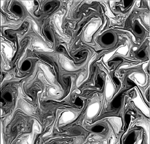 This is a simulation of a very idealized homogeneous system in which every point in this square domain is physically indistinguishable from every other point. The domain has no walls or boundaries, but is, rather, re-entrant in both dimensions -- as one leaves one side of the domain one enters on the other side. This system is proving to be of interest not only to atmospheric and oceanic scientists, but also to mathematicians, because of the fractal character of its solutions and due to the possibility that it can help us understand how singularities form in fluid flows.