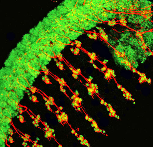 Here, red indicates the axons of neurons and green represents all nuclei in both the central nervous system and the peripheral nervous system. The thick bundle of green cells represents the ventral nerve cord (or central nervous system) which extends throughout the embryo and forms a future head structure at the anterior (upper right in the image).