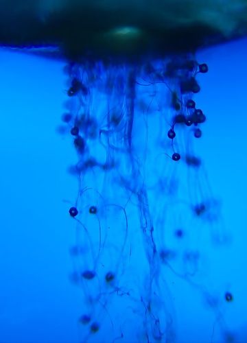 Laser printing of stem cells is currently being investigated for tissue engineering applications. This image shows a laser transfer from a model system of 20 micron polystyrene beads in glycerol used to simulate the transfer of human stem cells. The ejected plume is less than 500 microns wide yet moves at tens of meters per second. To freeze the motion, the image is strobed with a 25 nanosecond pulsed plasma lamp, 10 microseconds after the laser hits the ink.