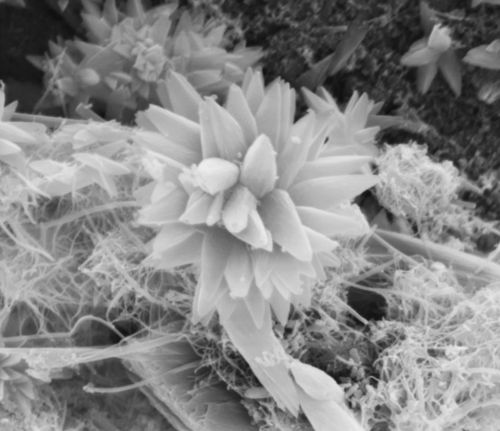 For my senior thesis in George Scherer's lab, I was investigating the best way to dry cement without doing any damage to the cement's microstructure. I tried drying cement samples in both a desiccator and a 105 degree Celsius oven. The oven-dried samples had hundreds, even thousands, of these cement "flowers," with noticeable "petals" and "buds." The width of this flower is approximately four microns.