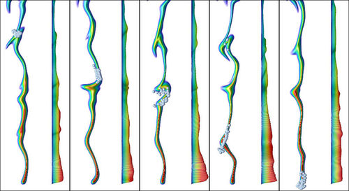 This image shows five snapshots of the time evolution of a group of sixty individuals progressing from a position on a filament to the source of the chemical. Each panel shows the view from above (left) and the concentration profile (right). The work demonstrates the ability of decentralized information processing systems to solve real world problems and also illustrates an alternative pathway to the evolution of higher cognitive capacity via the emergent, group-level intelligence that can result from simple low-level interactions.