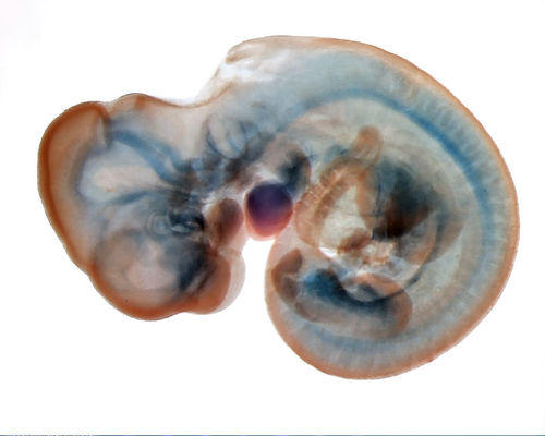 Shown is an embryo that has been stained such that the blue coloration indicates areas where MTDH is expressed during embryonic development at 10.5 days after conception. Expression is seen in the brain and spine rudiments, limb buds, and the heart.