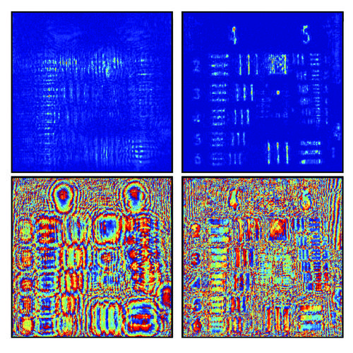 After propagating through exotic, nonlinear materials, light becomes distorted and unreadable, as different light rays "talk" to each other and mix up their information. Through nonlinear digital holography, this wave mixing, measured in the self-distorted image (left), can be undone to reconstruct the original signal (right). These experimental images demonstrate the ability of the method to reconstruct both the image intensity and phase, which is measured to within a fraction of a wavelength. This technique provides new possibilities in imaging and nonlinear physics applications, such as material characterization, improved imaging resolution, and sub-wavelength lithography.