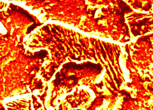 In the center of the image (magnified by ~5500 times) one sees a particular grain of pearlite that happens to be in a shape resembling a proud tiger. The tiger is approximately 10 microns long and 5 microns tall at the shoulder, or about 1/10 the width of a human hair.