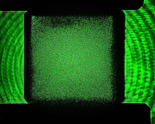 This initially clear crystal became grainy and wrinkled after interaction with incident light. This phenomenon is called "modulation instability" and it results from nonlinear interaction between electromagnetic waves and matter.