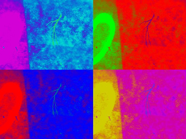 This is a composite of four filtered versions of an image captured on X-ray film. DNA was labeled with a non-radioactive tracer molecule and loaded onto an agarose gel to separate the molecules by size. Several of the samples were mixed with interacting molecules to cause a shift in the migration pattern of the DNA bands. I had intended to capture the results of the interaction on X-ray film. Unfortunately, when I removed the film from the felt-lined exposure chamber, I heard the crackle of static discharge. The image I had hoped to capture was ruined, but the discharge shows very clearly on the film. My aesthetic sensibilities aroused by this tiny bolt of lightning, I photographed the film through a series of filters on the machine we use to image our agarose gels. When I put the final image together, I realized that my ruined experiment was not a complete failure after all.