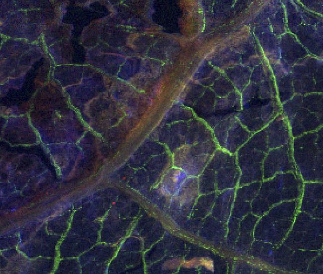 X-ray fluorescence microscopy allows geochemists to map the distributions of many different elements simultaneously in chemically heterogeneous natural samples. This is an X-ray fluorescence micrograph of a 5 x 6 mm section of a degraded white oak leaf taken from the forest floor in the Pine Barrens, New Jersey. Calcium is highlighted in green, manganese in red, and chlorine in blue. (Lighter color corresponds to more intense fluorescence, i.e. greater concentration.) Manganese appears concentrated in the large veins and in a more diffuse background concentration throughout the leaf tissue. Calcium is localized primarily in the smaller leaf veins. Chlorine occurs in particularly high concentration in the center of the image, near the delta formed by the leaf veins. Optical microscopy revealed that the area of high chlorine concentration coincided with the presence of a mass of fungi colonizing the leaf surface, implicating the fungi as important players in the natural chlorination of decaying plant material. Special thanks to Matthew Marcus, Lawrence Berkeley National Laboratory, Advanced Light Source, Berkeley, California.