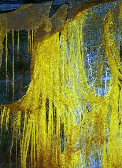 This is the story of Earth: where we are born, where we live and where we are buried. Inspired by art, nature and culture, I used vibrant dyes, cotton and polyester threads to design my unique piece. Earth images are reflected in my designed room. Looking down from an airplane, we know that earth is a plain land, but it is presented to us as an optical illusion. It could be a river or a chain of mountains. We are not sure about the depth and height of the land. It is simply appears to us as the magnificent creation and evolution of nature. I used innovative and manipulative techniques to create new textures. I wanted to unify forms and shapes in a particular way with the piece. These forms and shapes reproduce nature. The images are created on transparent fabric for its metaphorical and mystical lightness. Transparent surfaces allow light and air to circulate through and around the piece while creating an atmosphere of peace, wonder and magical beauty. I folded, layered, dyed, boiled and then stitched the fabric to reach the stage of transforming earth images to the cloth. I created an environment to embrace us as soon as we step inside this room. My intentions are to grab the far images of earth and present them closer to our eyes and tangible to our hands.