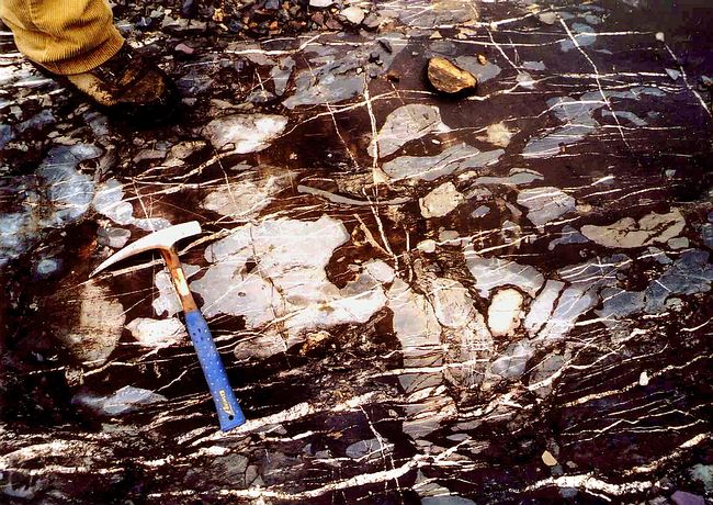 During the Taconic Orogeny, one of the mountain building events of the Appalachians, blocks of continental shelf were broken off into the ocean. Large storm events, coupled with increased erosion associated with the uplift of the mountains helped the breccias make their way to 5000 m under the sea. The breccia is limestone and forms odd angles due to a partial dissolution before the mud matrix filled in around it. The white quartz veins cut through the rock later. This rock, part of an outcrop east of Rutland, VT, is Ordovician (505-438ma) in age. A rock hammer is typically placed in geology photos for scale.
