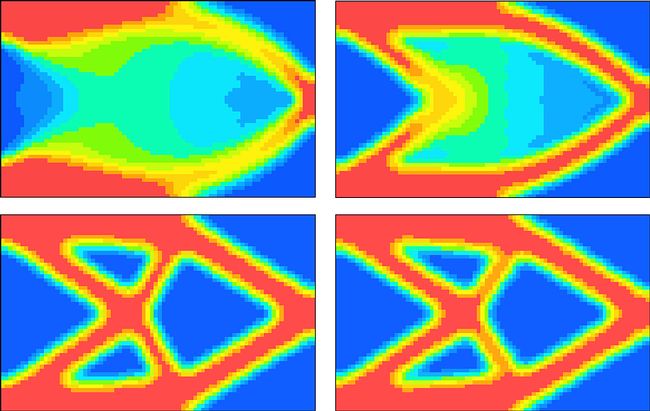 The design for a cantilever beam progresses clockwise from upper left using topology optimization. The beam is supported on the left side of the domain and loaded vertically at the midpoint of the right boundary. Solid material (red) is distributed within the design domain so that strain energy is minimized when using a limited volume of material.
