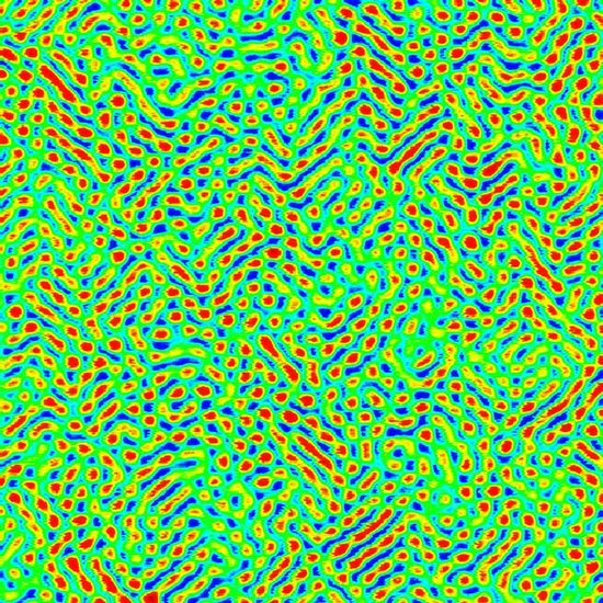 This image shows the topography of a buckled thin silicon-germanium semiconductor film measured by Atomic Force Microscopy over a 25µm x 25µm area. Under the film is a layer of glass supported by a silicon wafer. When the sample is heated to high temperature (750C), the glass flows and the film, which is initially smooth and flat but under compressive strain, forms buckles with an amplitude of about 30nm to relieve its strain. The buckles occur along the <100> crystal directions (which run roughly diagonal in this image) due to the asymmetric mechanical properties of the silicon-germanium crystal. Here, the data have been colored to highlight the periodicity and beauty of the buckles. This work was done in the lab of Professor James C. Sturm and the PRISM micro/nano fabrication facility, and is in collaboration with Karl D. Hobart of the U.S. Naval Research Lab.