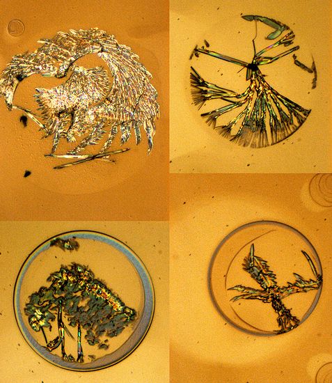 These optical microscopy images show the dye coumarin 47 deposited on top of a thin polymer film. The polymer, which emits light when an electrical current passes through it, can be used to make light-emitting diodes (LEDs). When mixed with the polymer, the dye changes the color of the light that the polymer emits. Droplets of a solvent containing dissolved coumarin 47 were printed onto the polymer film. After the solvent dried, the dye was left behind. In the center of the original droplets crystalline patterns of the dye formed on the polymer surface. The crystalline patterns of the deposited coumarin 47 dye take various forms, resembling trees, a dancer, a mother phoenix feeding her baby, etc. Each pattern is about 100 microns wide. These shapes are formed purely by nature, but since they are so vivid one might think that they were actually created by an "artist of nature." (Advisor: James C. Sturm)