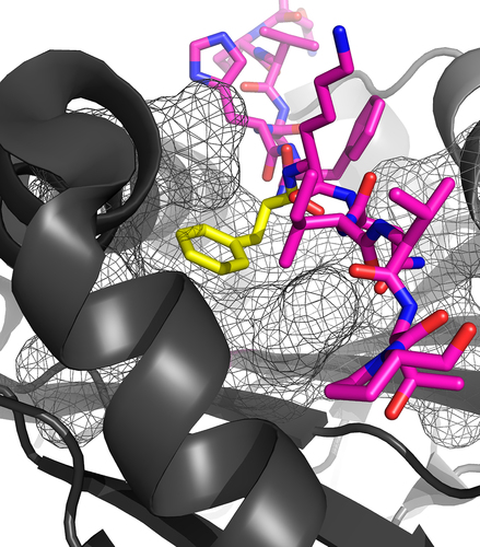 The mesh in the image shows the surface of the antigen at a particular binding "pocket," allowing us to determine how well the yellow amino acid side chain of the peptide fits into that pocket. In the case of this particular pocket we can see that in order to bind more efficiently, the amino acid side chain should have more favorable energetic contacts than the template side chain offers.