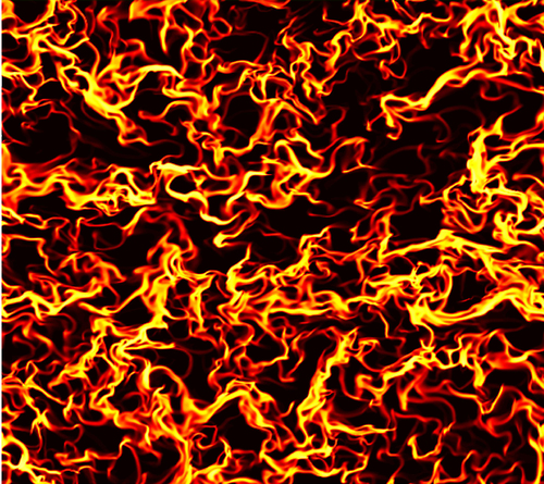 This image is a snapshot of the particle concentration field in a gas-solid flow obtained from a two-dimensional finite volume simulation. Bright orange regions correspond to regions of high particle concentration, while regions in black correspond to regions with very low concentration. These complicated flow
