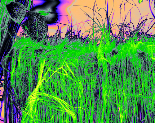The nanowires seen here in green are synthesized with nickel using an electro-deposition method that causes them to grow (much like grass in the springtime). Such nanowires hold promise as key components of environment and health sensors and energy-scavenging devices. At the upper left we see a butterfly-like figure; these micro-shells are a byproduct of the process of making nanowires. We are not sure why these micro-shells form or whether they have any useful applications in their own right. This image was taken with an Environmental Scanning Electron Microscope, which allows us to see nanostructures in their native state with extraordinary three-dimensional clarity. Field of view: 50 microns.