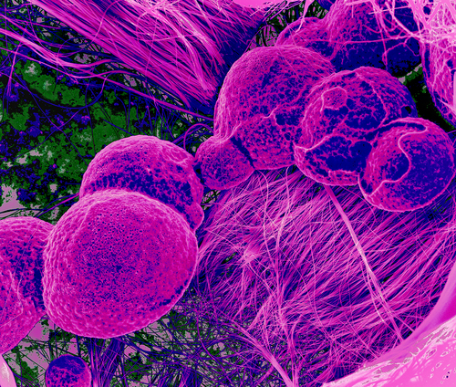 This image was taken with an Environmental Scanning Electron Microscope, which allows us to see nanostructures in their native state with extraordinary three-dimensional clarity. Field of view: 60 microns.