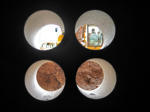 In preparation for the new Chemistry building, Princeton University's Jadwin Hall 5kV electrical feeders needed to be relocated. This picture shows the penetrations that have been made in the areaway wall -- a wall that runs between the building foundation and the south lawn of Jadwin Hall -- to make way for the new run of power conduit. Peeping through the upper holes in this image, one can glimpse a yellow Excavator, one of the pieces of heavy equipment used to construct the new Chemistry building.