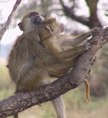 The sun was now dropping near the horizon. Alice's attention was caught by the flight of hundreds of white egrets, coming to roost. The baboons of Alice’s group moved slowly closer to the sleeping trees, a different grove than the one they used the night before [50]. This grove, too, was one that was big enough for all members of the group to find high spots on trees whose branches were not very horizontal or very low, important for safety from predation by leopards at night. Well before it got dark, they would be safely up in the trees. With the setting of the sun, the dry air quickly became chilly. Alice snuggled against Alto and was soon asleep. |