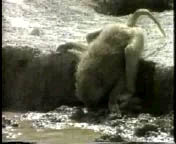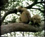 All too soon, they were on the move again. The best part of the trip was ahead of them, though. Near the dry edge of Lake Amboseli, some three kilometers from where the baboons had begun the day, they came to an area of young fever trees. Wherever the bark of these trees is broken open, a viscous, sweet gum exudes. It is the baboons' candy. They spent much of the next two hours searching the young trees for pieces of the sweet gum [20, 4, 65, 135]. Suddenly, adult male Max began chasing a young Cape hare. He quickly caught it and began tearing through the skin with his teeth. The other baboons watched. Some of the adult males that were dominant to Max thought of trying to take the hare away from him, but it was small and they knew he would put up a fight to keep it. Among baboons, "possession is nine-points of the law" [4, 19]. Several juveniles and infants came near Max as he ate. Any that got too close were threatened away by him. The exception was Fred, who was born the same week as Alice. Max was a frequent associate of Fred's mother. He probably was Fred's father, and had treated Fred preferentially since Fred was born. As a result, when Max fed, Fred was often allowed to sit next to him and to pick up scraps of Max's food. As on other occasions, Fred now got small pieces of meat that Max dropped. Meat is a far richer food than the baboons' usual vegetarian diet, but it is not an unmixed blessing [21]: Fred, like Max, had tapeworms. In mid-afternoon, the baboons began the long walk back to one of the woodlands and to a familiar grove of sleeping trees that they would use that night. Along the way, they stopped to feed in a field of the tall, dense Sporobolus consimilis grass. Alice was always tense when they first entered large areas of this grass. You never could be sure whether a leopard or a hyena was hiding in it, and at first the baboons startled at any sudden rustling of the grass [4]. It helped to live in a group and be able to take advantage of 40 pairs of eyes and ears [11]. Soon the baboons relaxed and began to feed. They tore off lateral branches of the grass, used their teeth to remove the tough outer layers, and then ate the soft, succulent, white core of the stem base [135]. Alice had lost sight of Alto in the tall grass, but she could see three-month-old Hans clinging to his mother, Handle, and Alice knew this meant that adult male Even, who often acted as if he were Hans' godfather, probably was not far away [27]. Besides, she was reassured by the squeaking sounds around her, made when grass cores were pulled out of their sheaths. The sounds meant that she was safely surrounded by feeding baboons, even though most were out of sight in the tall grass [4]. Later, as the group approached the woodland, Alice chased a butterfly, but she couldn't catch it. For a while she joined a group of older youngsters that were playing "King of the Castle" on a Salvadora bush, but she soon quit [4]. The baboons had walked over eight kilometers in the open sun that day, and Alice was tired [129].