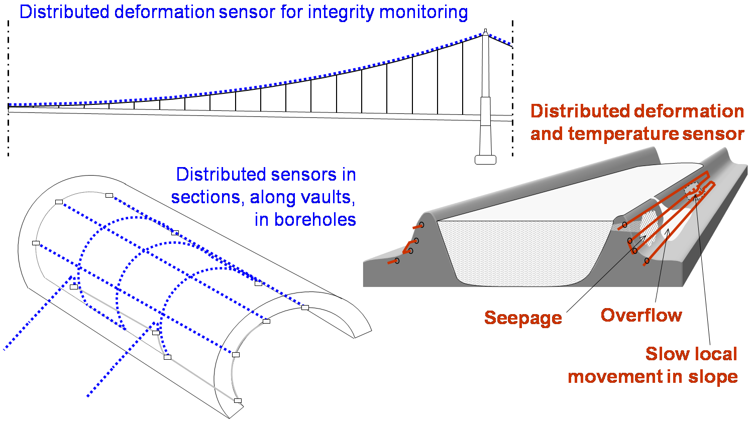 With reference to their spatial disposition, strain sensors are classified as discrete (point) sensors or as distributed (continuous) sensors. With respect to the gauge length, the discrete sensors are conventionally classified in two groups: short-gauge and long-gauge sensors. Depending on the chosen sensor type the monitoring is performed at local material, global structural, or global integrity level.