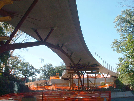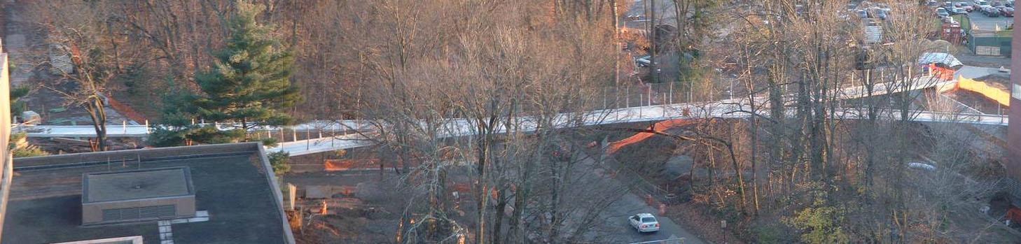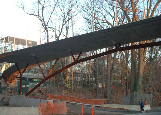 The Streicker Bridge is a new pedestrian bridge built at Princeton University campus, over the busy Washington Road. Besides its primary aim, to provide and facilitate safe pedestrian crossing over the Washington Road, the bridge has strong symbolic and aesthetic significance. Created as a part of Princeton University’s Natural Sciences neighborhood, the bridge connects the Icahn Laboratory (Lewis-Sigler Institute for Integrative Genomics) and new neuroscience and psychology building (under design) on the west with Jadwin Hall (physics), new Chemistry building, and Lewis library on the east. The bridge will “stand as a tangible symbol of the cross-disciplinary collaborations that are central to scientific research and teaching today” (President S.M. Tilghman in News at Princeton 2006). The bridge’s “X” shape in plane symbolizes these cross-disciplinary collaborations, and the arch itself represents the south entrance gate to Princeton Campus.