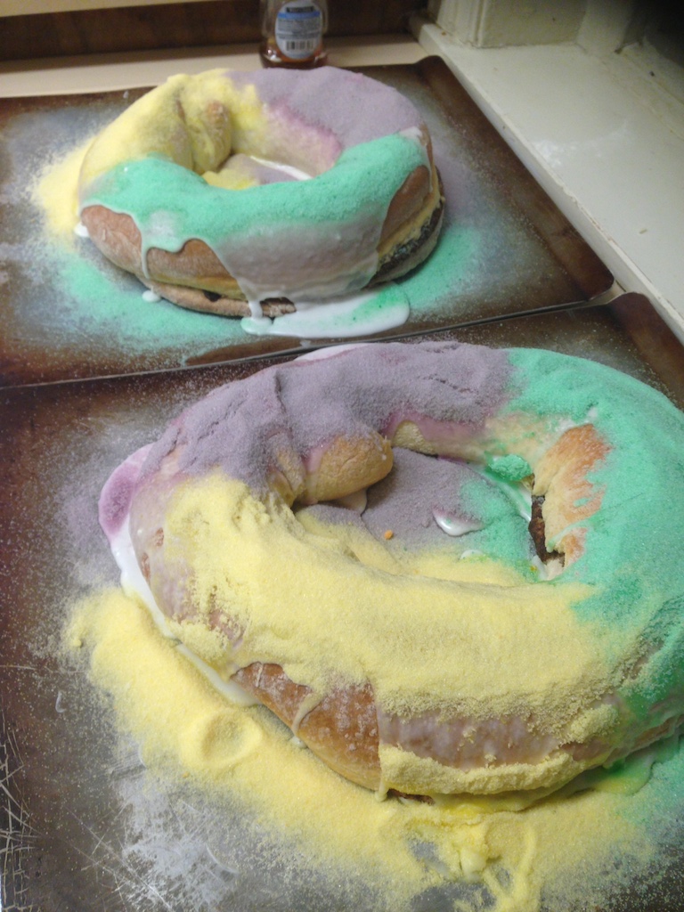 Now make the colored sugar. Fill 3 bowls with granulated sugar. Add a few drops of food coloring (normally about 5 drops), making one bowl yellow, one green and one purple. Mix with your fingers until sugar is evenly dyed. Sprinkle over the cake.