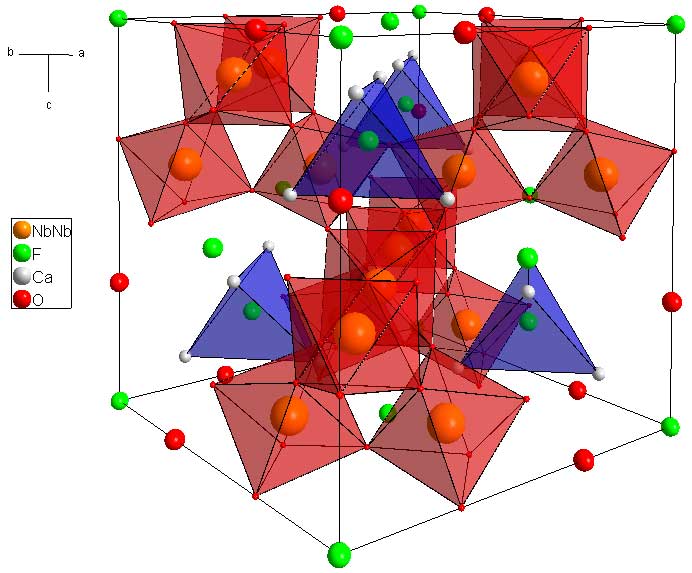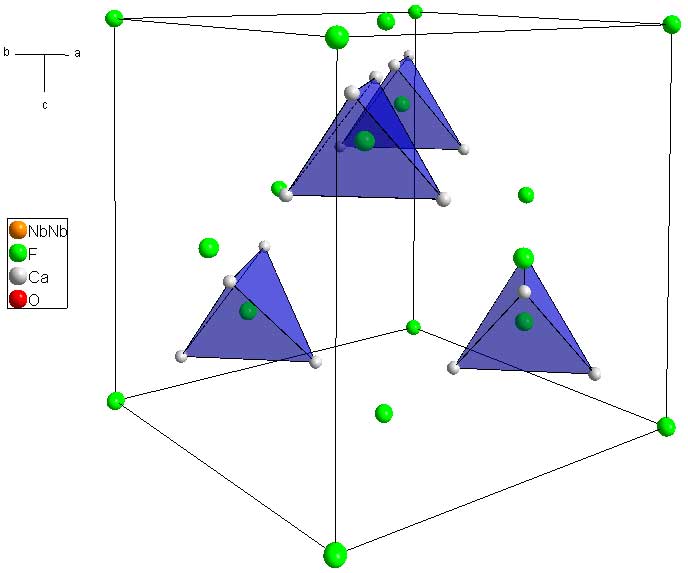Ca2Nb2O6F (download cif) is the nominal pyrochlore mineral. The general formula for Pyrochlore is A2B2O7, or more accurately: A2B2O6O'. In the case of nominal pyrochlore, F occupies the F' site. Pyrochlore is highly symmetric, and is face-centered. The easiest way to begin to visualize the structure is by looking at the unit cell with only the F and Ca atoms (the A and O' atoms of the general formula):
