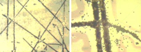 Optical microscope images of colloidal particles (2µm polystyrene) forming on an ITO coating on a PET substrate. (Left) Cracks in ITO layer formed by bending the substrate induces the preferential coagulation of particles in the cracks. (RIght) A higher magnification image shows the formation of close-packed particles in the cracks.