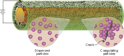 To expand the self-healing concept to other technically important materials, such as metals and ceramics, new methods involving electric-field induced colloidal aggregation are being explored. This technology is being tested initially with a system that contains two concentric cylinders (the inner one has a thin layer of insulating ceramic coating), with an electrical field applied to the system as shown in the following schematic. Between the two cylinders is a colloidal dispersion of polystyrene or silica particles, which are used to repair defects that occur in the inner cylinder when high stress is applied. When a defect occurs in the insulating coating, underneath metal is exposed to create high current density at the damaged site, causing colloidal particles to coagulate around the defect [4].