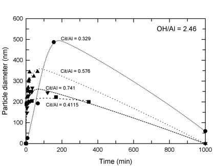 Particle growth remains rapid but subsequent diminution is slowed in the presence of citric acid under conditions of high hydrolysis. At higher OH/Al contents, particle growth can be stopped using sufficient citric acid (~0.8 citric acid to aluminum by mole).