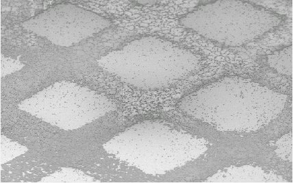 Scanning electron microscope images of a pattern composed of 2µm polystyrene particles. The dark (particle-filled) areas correspond to regions illuminated by UV, while the white (relatively empty) areas correspond to regions where the mask blocked the UV light. [1]