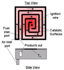 The Swiss roll device consists of two parallel spirals connected by a vertical via. The air fuel mixture is heated in the inlet spiral and ignites; the combustion products continue through the outward spiral, transferring heat to the incoming air/fuel mixture.