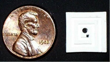 Cross-section of alumina burner produced using stereolithographic methods. Note square via hole that would connect this spiral to the 2nd parallel spiral 1 mm away.