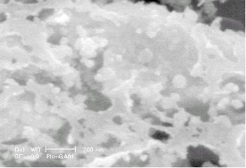 The reactor uses flameless catalytic ignition to burn the air/fuel mixture. This allows the reactor to operate below 300°C. To obtain catalytic ignition requires two post-sintering steps. The first is to coat the inside walls of the reactor with a fine gamma-alumina powder and adhere the powder to the walls by calcining at 800°C. The second step is to coat the gamma-alumina with platinum metal using an organic precursor that is reduced by forming gas to metallic platinum. The following figure is a SEM micrograph of the high surface area platinum-coated gamma-alumina.