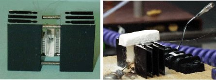 Stereolithography is used to fabricate the reactor. This process builds the reactor using a photo-curable polymer in an electro-sterically-stabilized ceramic suspension. After drying, the reactor is reactor burned out at low temperatures and sintered at high temperatures (1550°C) to full density. A cross section of an alumina burner is shown below where one of the two interconnected spirals can be seen.
