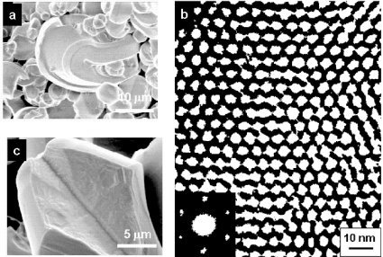 Hierarchical structure of mesoscopic silica: (a) micron sized structure - SEM image of particles with unusual curvature and thin films; (b) nanometer level structure - TEM image of monodisperse, well packed, tunable channels; (c) both micron and nanometer length scales are visible - the particle (micron) and the hexagonal internal structure (nanometer).