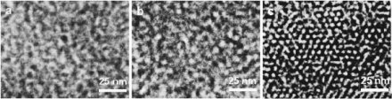 Structural evolution at the nanometer length scale. TEM images of mesoscopic silica thin film sections examined at (a) the beginning, (b) the end of the incubation period, and (c) partway through the induction period. Note the well packed channels in final image.