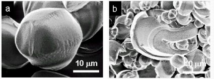 We have also examined the structural evolution at the micron length scale (below). Mature particles possess distinctive curvatures, while particles collected at earlier times show some evidence of amorphous structure (in the sense that the edges are not well defined).